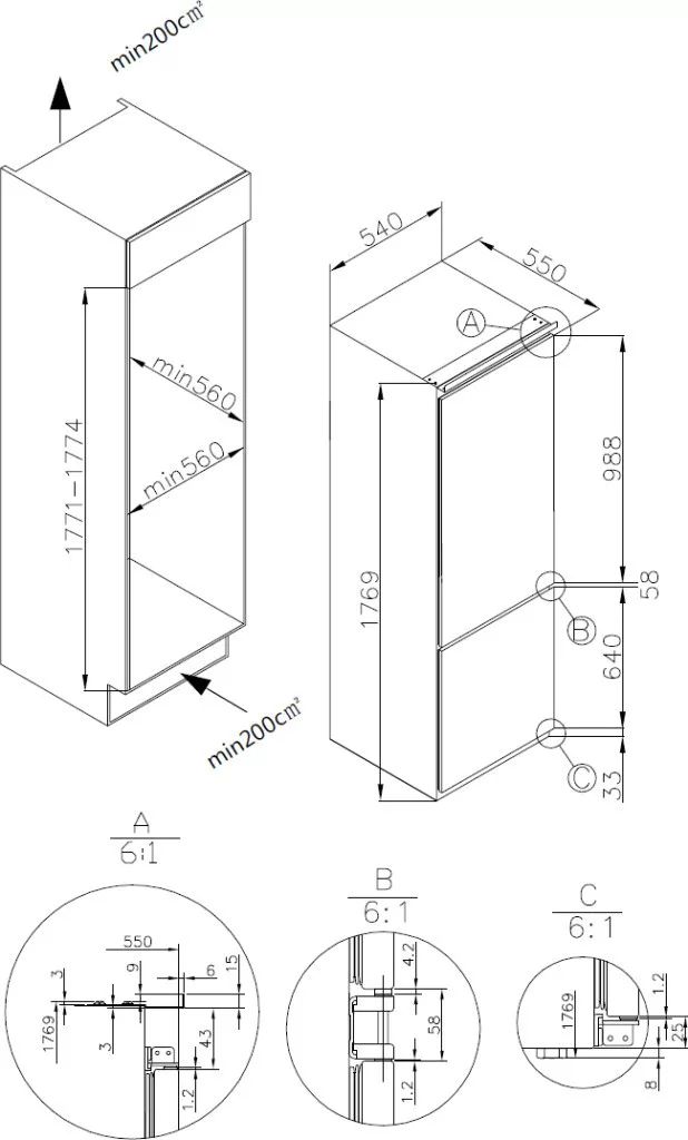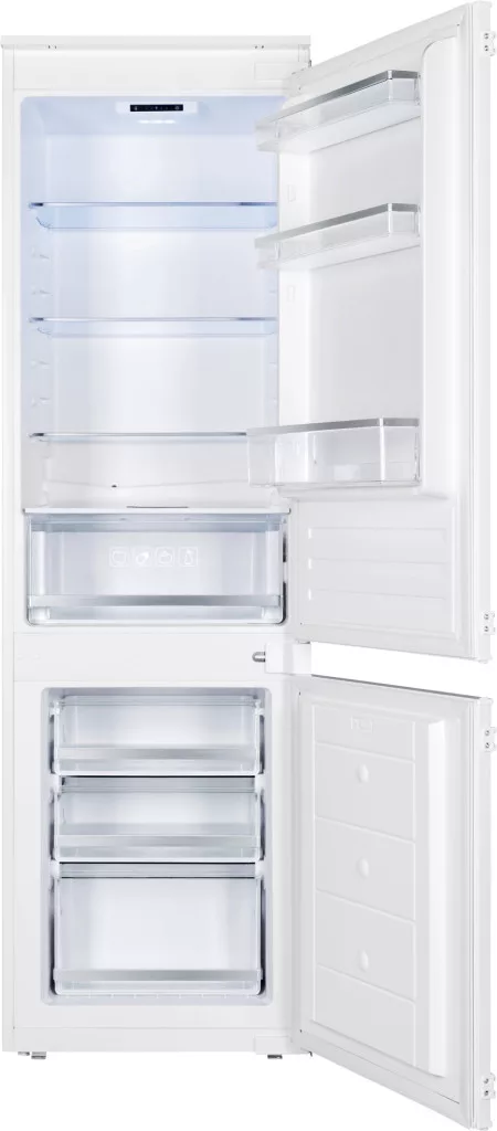 Beépíthető kombinált hűtőszekrény alsó fagyasztóval; Less Frost technológia, amely mérsékli a dérképződést és megkönnyíti a leolvasztást; fehér kivitel; fehér, megvilágított kezelőelemek; belső LED világítás; ajtó felszerelése csúszósínekkel; megfordítható ajtónyitási irány; klímaosztály SN, N, ST, T; energiaosztály E; éves energiafogyasztás 221 kWh; zajszint mindössze 35 dB(A); tömeg 50 kg; méretek (Ma×Sz×Mé): 176,9 × 54 × 55 cm.